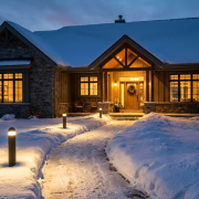 Lors d’une visite de maison un soir d’hiver, l’éclairage joue un double rôle : il sécurise les déplacements et sublime la propriété.